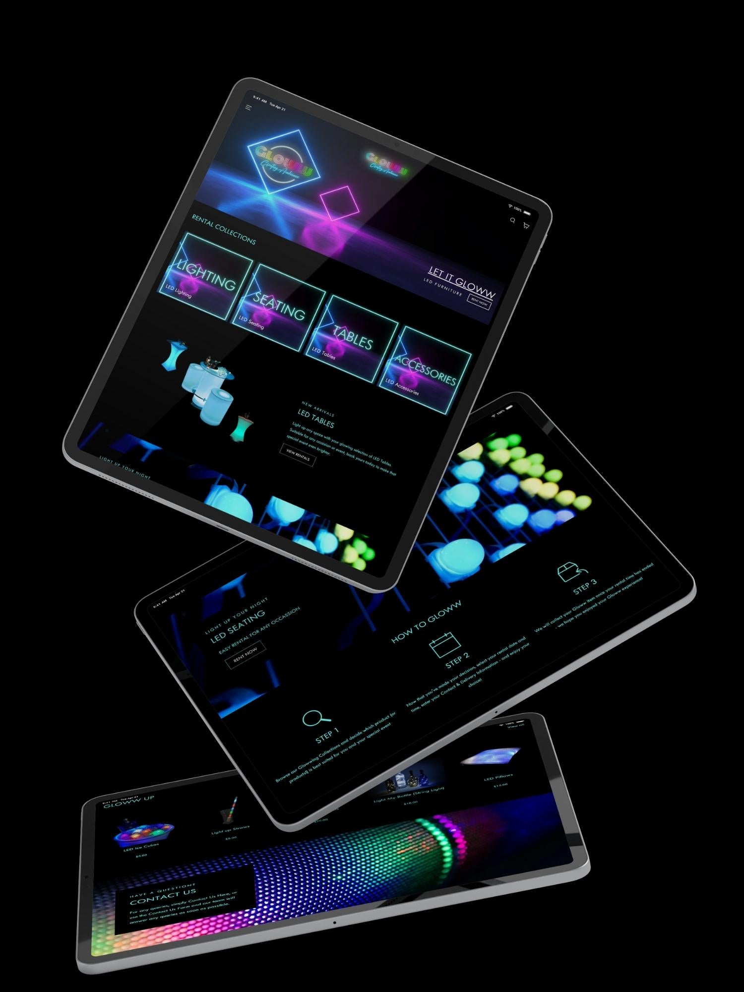 The client wanted to create a website for her brand new rental lighting company. The desired look was dark, with bursts of color throughout the homepage using imagery and a bright color palette.